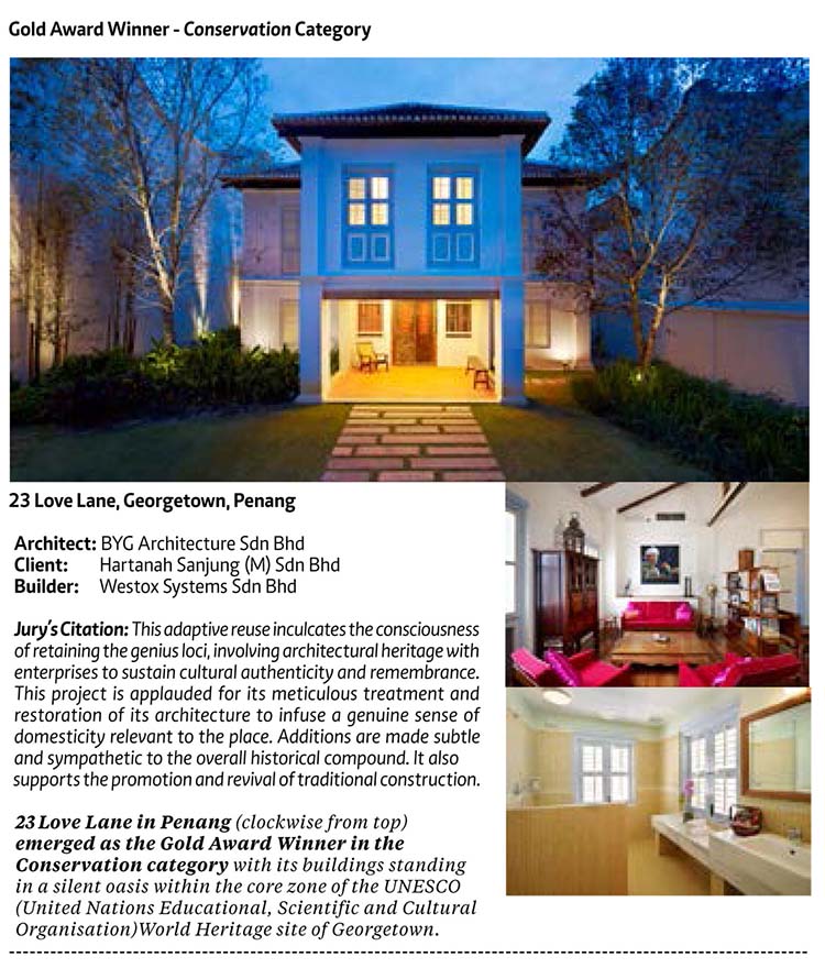 23LoveLane won the Gold Award for Conservation at the Malaysian Institute of Architects PAM Awards 2013