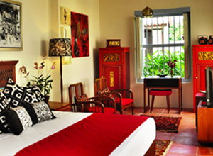 A little secret hideaway, this room can only be accessed through a gravel path, away from the main building. Decorated in a bold palette of reds, black & white, this room with its en-suite outdoor shower room is perfect for couples who wish for privacy.